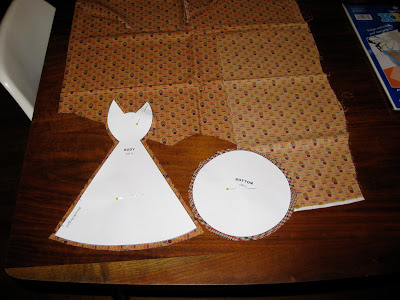 I have to admit, when pinning the bottom piece onto the body of the cat, it seemed as if the bottom was too big. I just pinned and pushed the fabric around until there were only a few little bumps in the bottom fabric. When I was sewing it up, the foot glider worked it all out and I finished with a smooth edge. Whew...thank goodness.