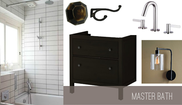 He loves the clean lines of the stacked white tile above. I love the knobs, hooks (from Hobby Lobby, kid you not) and lighting (West Elm) seen above. He picked out the faucet and we agreed on the Hemnes vanity from Ikea. (Which may or may not work with the sink we want...sigh of frustration inserted here.) Then I'll be adding estate sale finds and other eclectic bits and bobs...