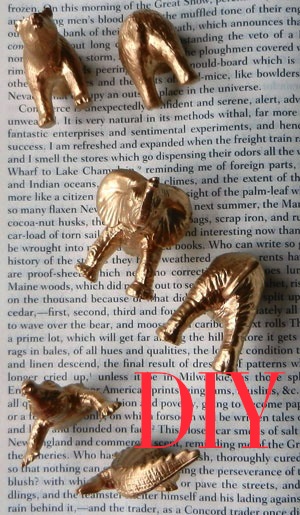 once glue/putty is dry, lay animals on a flat surface (i used an empty cereal box) and apply several light coats of spray paint until the animals are completely covered